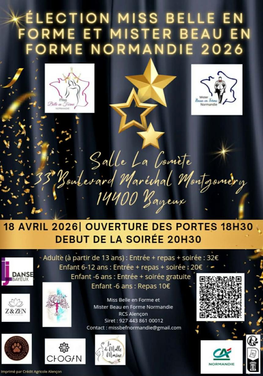 • Réservations sur : helloasso "Election Miss Belle en Forme et Mister Beau en Forme Normandie 2026" ou en scannant le QR Code de l'affiche