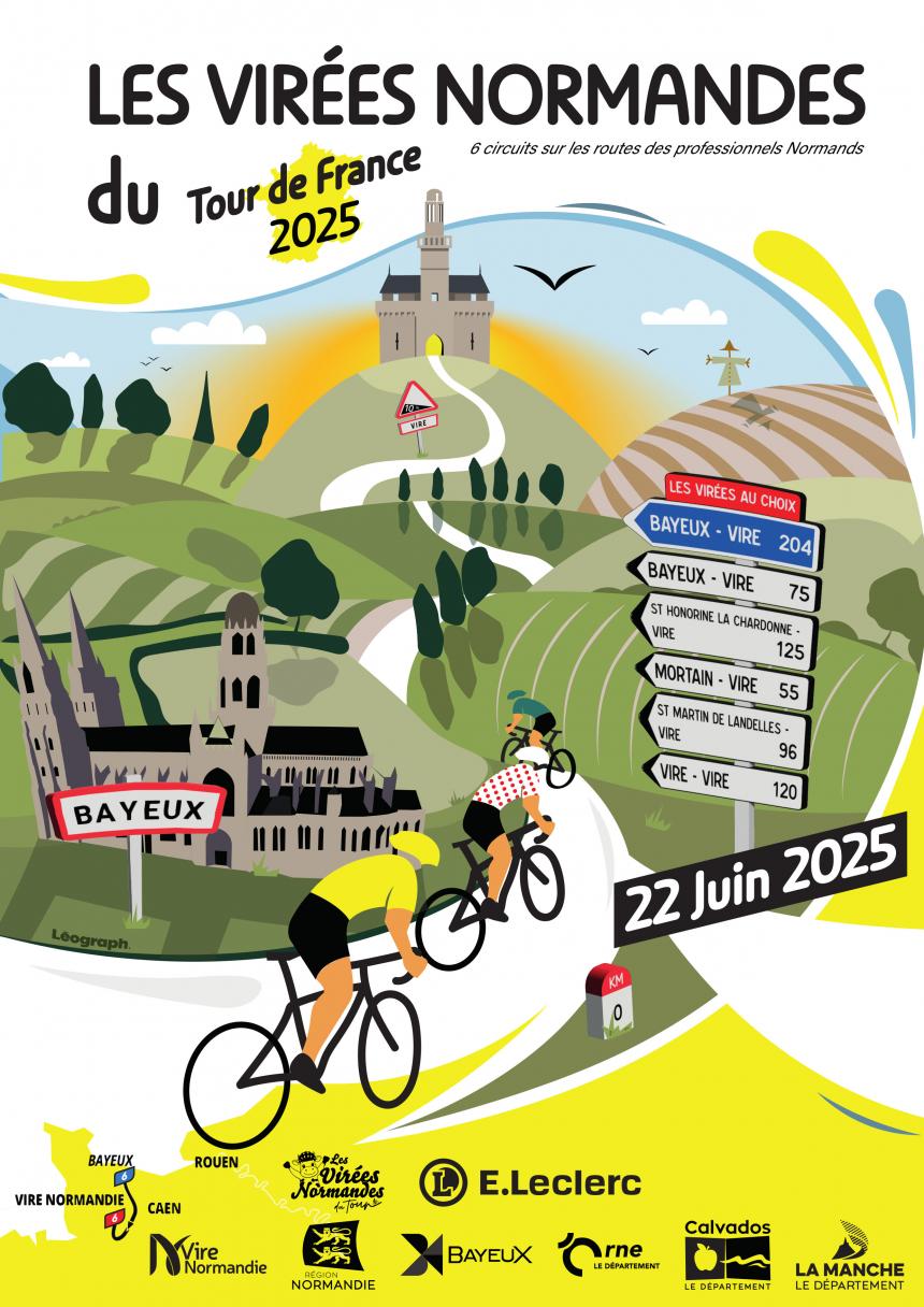 Deux virées au départ de Bayeux : l’étape Bayeux-Vire du Tour de France (201 km) et la « Kévin Vauquelin » qui ralliera les deux villes en un itinéraire plus direct de 75 km. Plus d’informations sur la page Facebook Les Virées normandes du tour