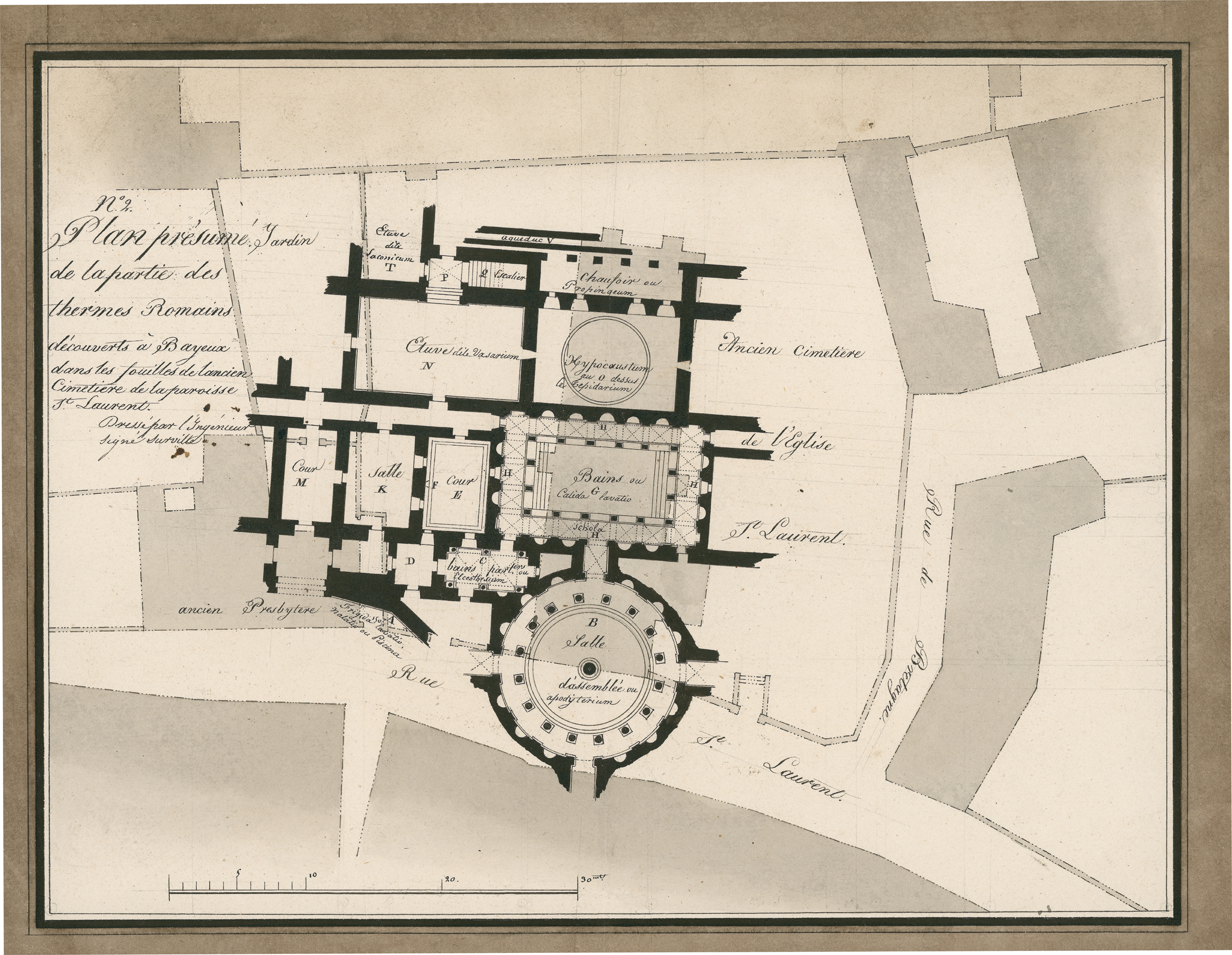 En 1760, des fouilles – menées dans le cadre de la reconstruction du chœur de l’ancienne église Saint-Laurent (actuel Auditorium) – révèlent les vestiges d’un monument dont on ignore alors l’origine. Les premiers éléments relevés – marbres de différentes couleurs, corniches moulurées – laissent penser à un temple richement décoré. Ce n’est qu’en 1821, après des travaux de terrassements et la mise au jour de nouveaux vestiges, qu’une commission composée du sous-Préfet, du Maire et de l’ingénieur des Ponts-et-Chaussées Eugène Surville (voir ci-après) lance une nouvelle campagne archéologique. Si celle-ci ne permet pas de délimiter le site, elle révèle sur près de 450 m² sa structure et son organisation : bassins, salles de chauffe, vestiaires, couloir, hypocauste et système d’arrivée et d’évacuation des eaux confirment l’hypothèse d’un établissement thermal. Au total, après de nouvelles phases de fouilles et de sondages, une dizaine de pièces sont identifiées sur une zone de près de 1 500 m². De nombreux objets sont également collectés. Parmi eux, des débris de poterie romaine, des pierres de marbre taillées en petits morceaux comme des mosaïques, des médailles antiques... Daté du IIe siècle, cet établissement est vraisemblablement plus vaste que celui de la rue Laitière avec une salle circulaire accueillant un bassin de neuf mètres sur onze, une salle rectangulaire et sa piscine de dix mètres sur cinq, une cour intérieure et de nombreuses salles de service.