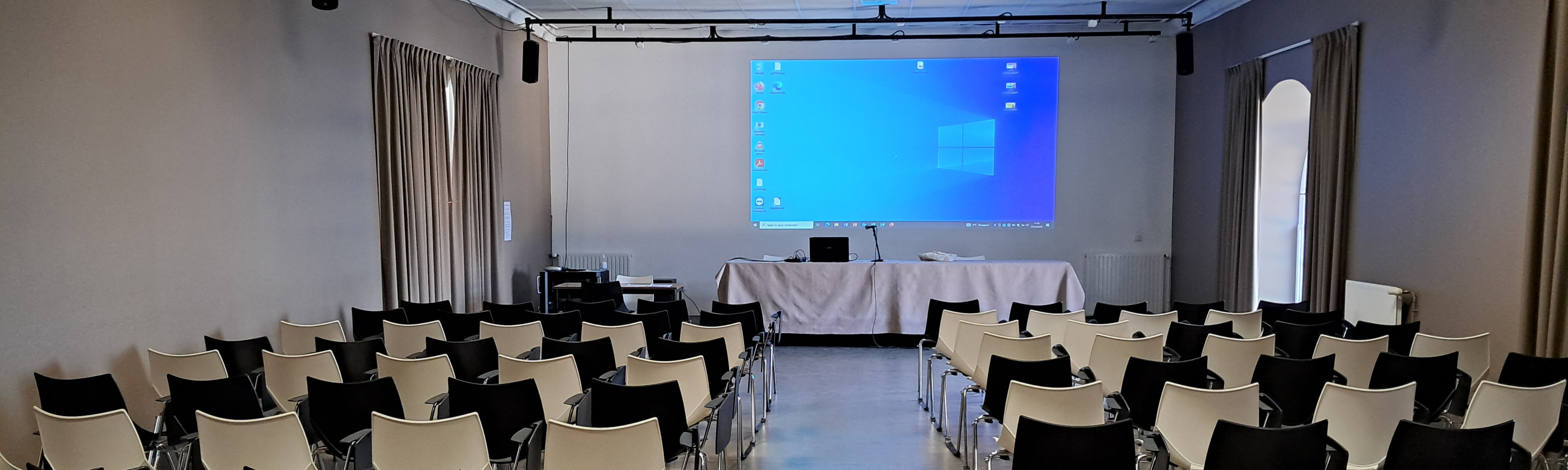 Configuration « théâtre » avec estrade, vidéoprojecteur, micros, sonorisation et rideaux occultants. Idéale pour conférences, projections ou assemblées générales.